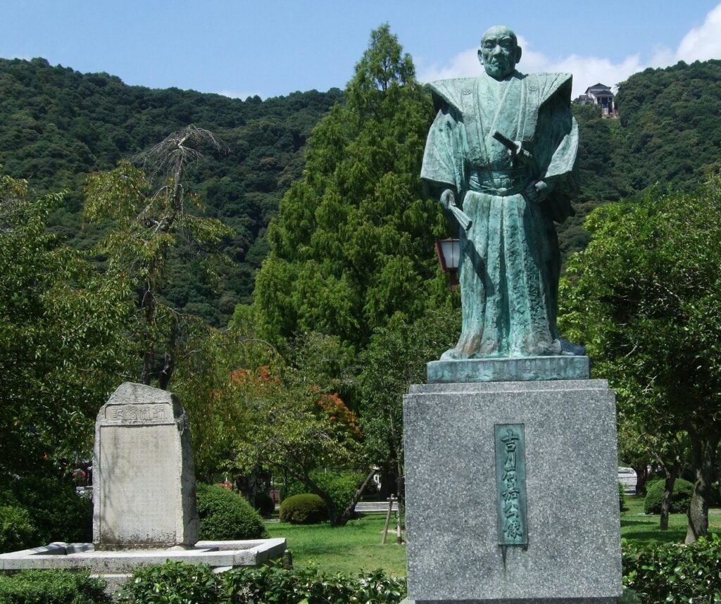 吉香公園に理数系殿様(?)吉川広嘉の銅像がある。左奥に写っているのが「錦帯橋記」で、「弘化二年乙巳春三月 玉惇成撰」とある。玉乃九華(たまのきゅうか)という岩国を代表する儒者による撰文である。