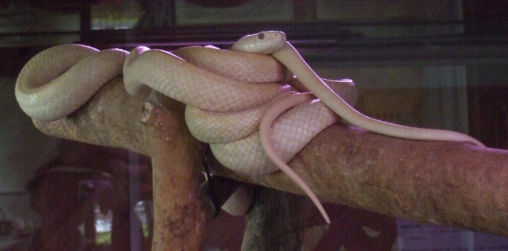 白い米を食べるネズミを食べて白色になったというのは荒唐無稽で、実際にはアオダイショウのアルビノ(突然変異による白化)で、世界的にも珍しいようだ。