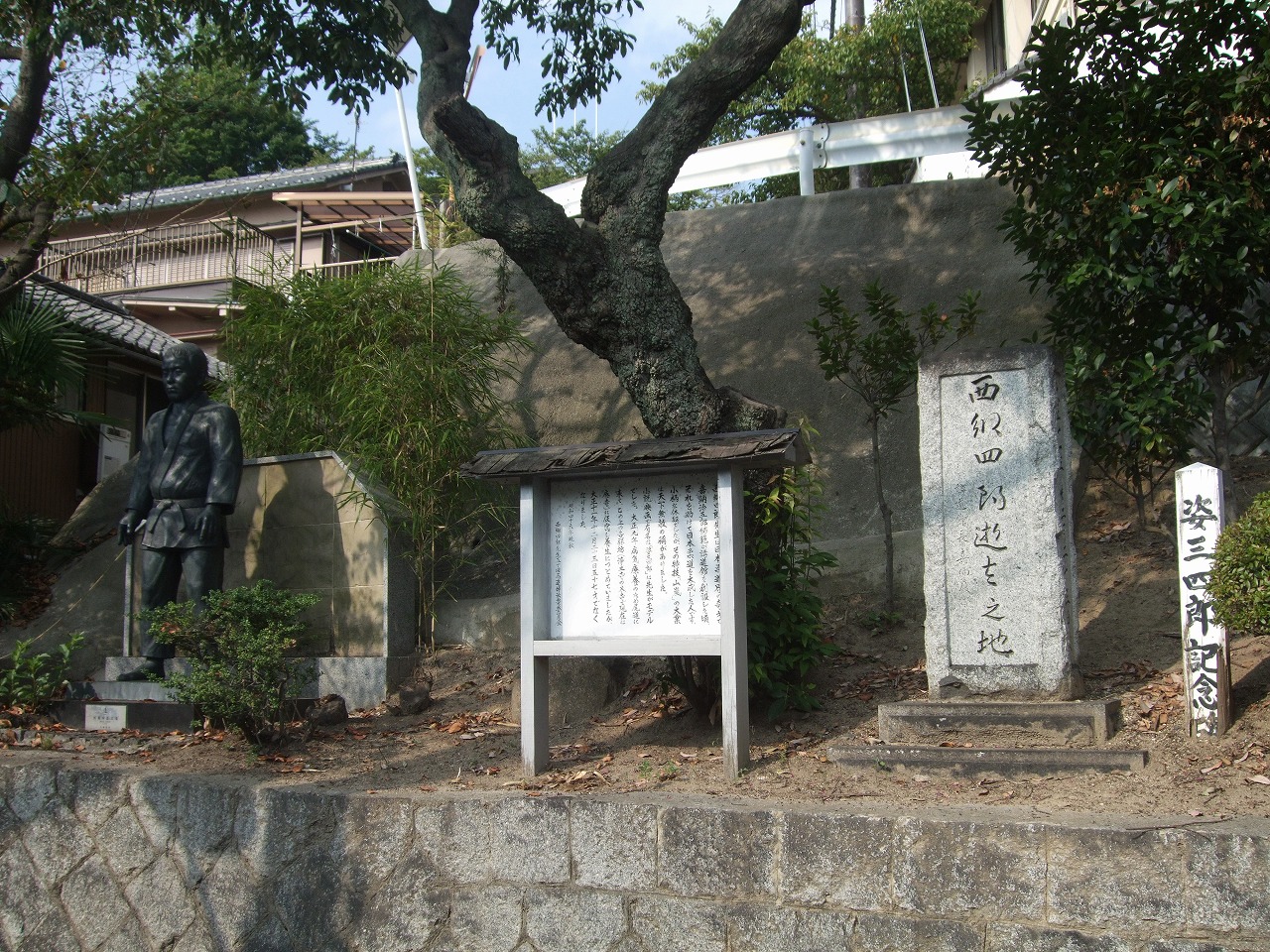 尾道市東久保町に「西郷四郎逝去之地」の石碑がある。その右には「姿三四郎記念碑」との木柱が、左方には西郷四郎の像が立つ。