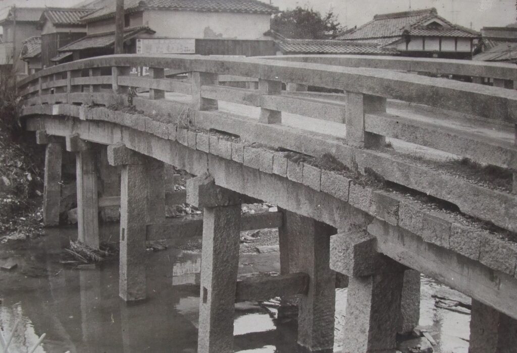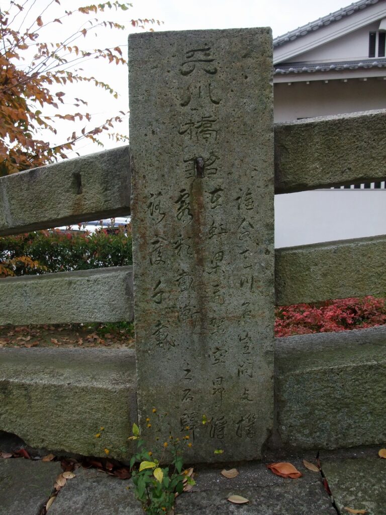 姫路藩が文政一一年(一八二八)にこの地より南西二〇〇メートルの旧西国街道の天川に架橋した総竜山石製の太鼓橋。全長二六.六メートル、幅四.四五メートルで、高さは約五メートルで橋脚五本。印南郡石工瀬助・仲右衛門の作。姫路藩儒者近藤顧一郎撰の銘文が刻まれてある。橋の東北詰めには高札揚があった。昭和四七年九月九日の出水で中央部橋脚が崩れ橋桁が落下したため撤去し、昭和五三年一〇月現在地に移設保存した。高さは地形に合わせて低くしてある。地形中央部の低いところは御着城の濠跡。