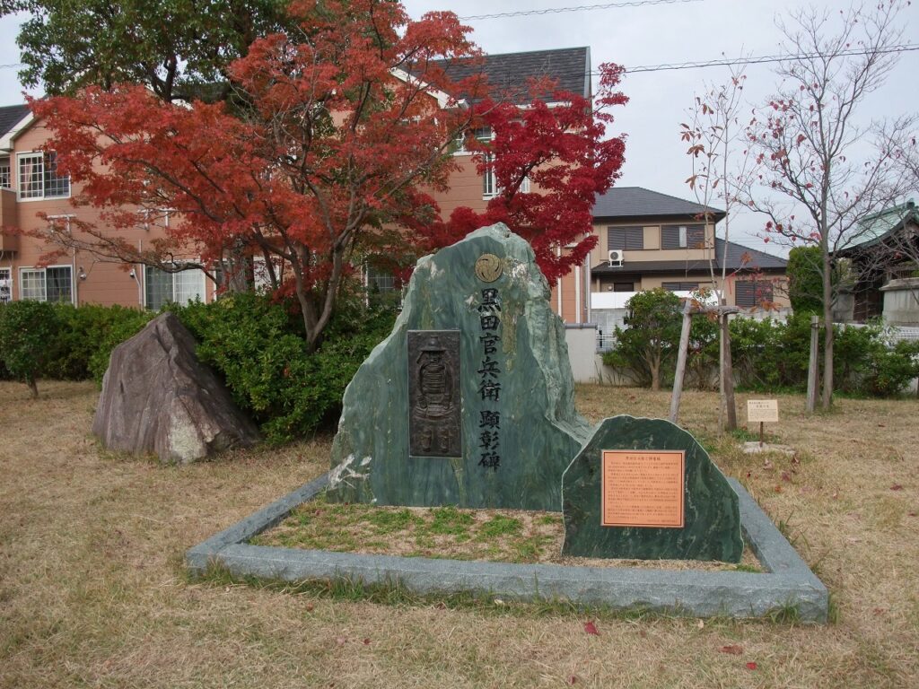 この地は、かつての御着城二の丸跡付近に位置し、西側の本丸跡付近には黒田孝高の祖父重隆と父職隆の妻(孝高の母)を祀った黒田家廟所(姫路市指定文化財)があります。また南側には小寺氏を祀った小寺明神があります。