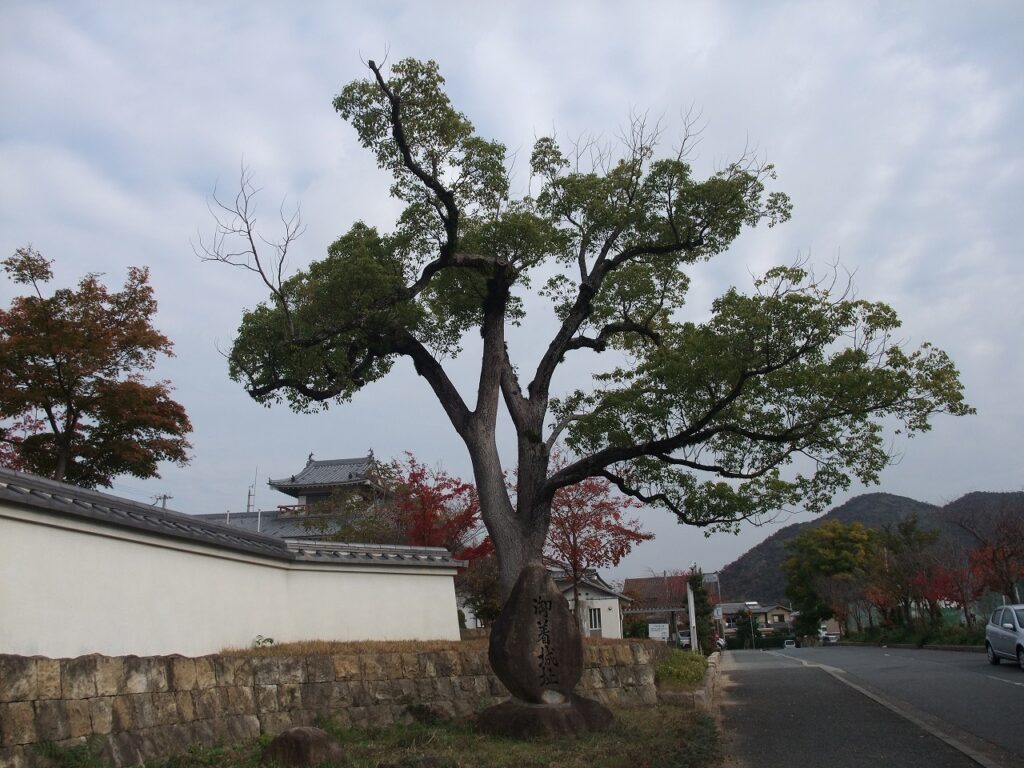 ここは御着城のあった場所である。官兵衛が家督を継ぐまで近習として仕えた小寺政職(まさもと)の居城である。「御着城址」の石碑もある。塀の上に天守閣を戴いた東出張所が見える。