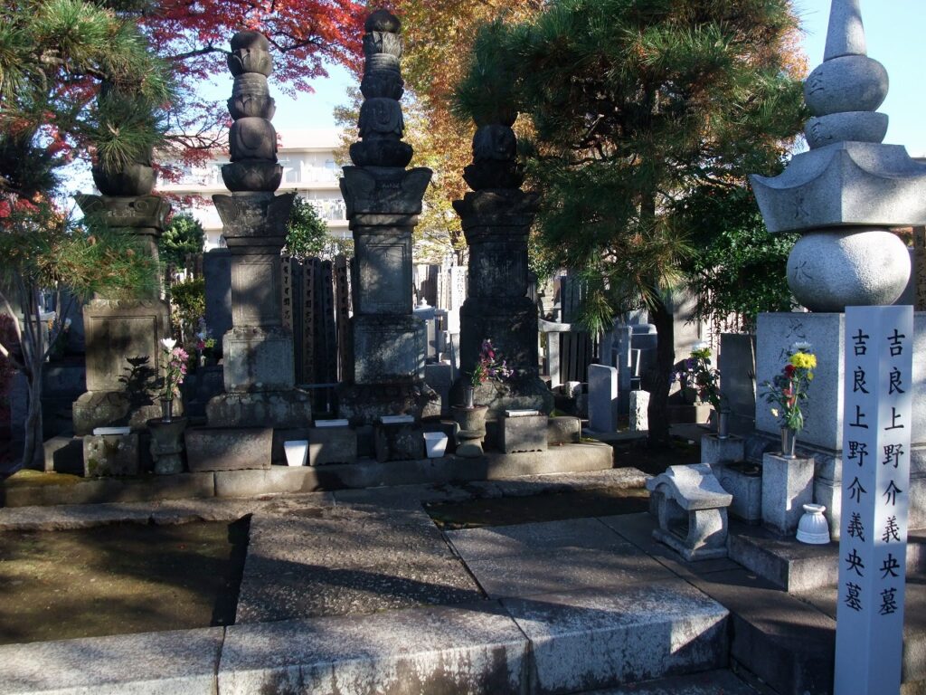 幕府高家の吉良家は、この寺を菩提寺としていました。義定(よしさだ)・義弥(よしみつ)・義冬(よしふゆ)・義央(よしなか)の四代にわたってその墓石・供養塔が建てられています。高さの違いはありますが、いずれも宝篋印塔です。相輪部の彫りが深く、特に請花(うけばな)や笠部の隅飾突起(すみかざりとっき)は、どれも外方に向って突出するなど江戸時代の作風を示しています。
