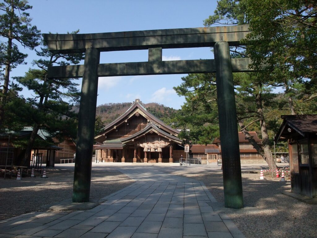 今年も出雲大社は初詣で賑わっていることだろう。例年60万人ほどの人出だという。私が訪れたのは一昨年の12月、拝殿は仮の本殿「御仮殿」とされていた。大社には4つの鳥居がある。鉄筋コンクリート製の宇迦橋の大鳥居を一の鳥居とすると、二の鳥居が木造で、三の鳥居が鉄製、そして写真の四の鳥居となる。