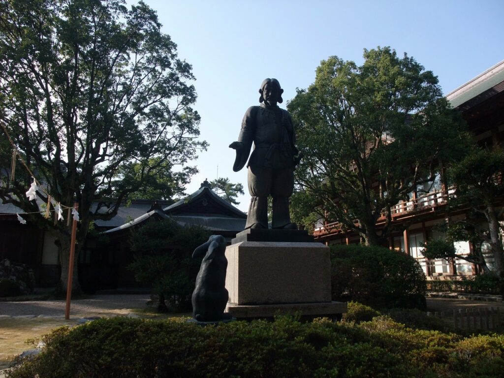 尊福卿は、オオクニヌシの再来ともいうべき有徳の人物である。オオクニヌシは哀れな兎を助けた心優しい神様である。境内に因幡の白兎の像がある。