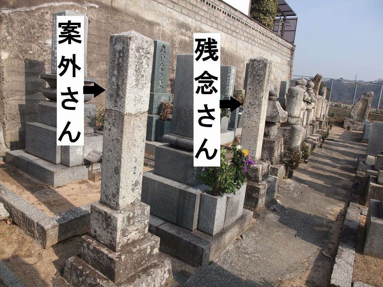 尾道市西久保町に「残念さん」と「案外さん」の墓がある。墓碑の上部に残念さんは「長門」、案外さんは「長藩」と刻まれている。どちらも長州藩兵である。