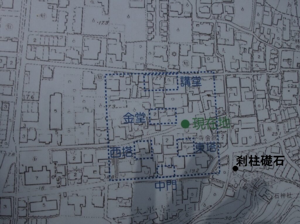 実は石神社の境内の礎石の位置に塔が屹立していたのではない。礎石は動かされている。元の場所は下の地図のとおりだ。