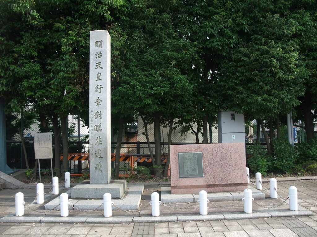 台東区橋場二丁目に「明治天皇行幸對鷗荘遺蹟」と刻まれた石碑が立つ。「正二位勲一等伯爵田中光顕敬書」とあり、明治天皇の宮内大臣をつとめた田中光顕の書であることが分かる。碑は台東区側に建てられているが、「対鴎荘」は白鬚橋の西詰、荒川区側にもまたがって建てられていた。