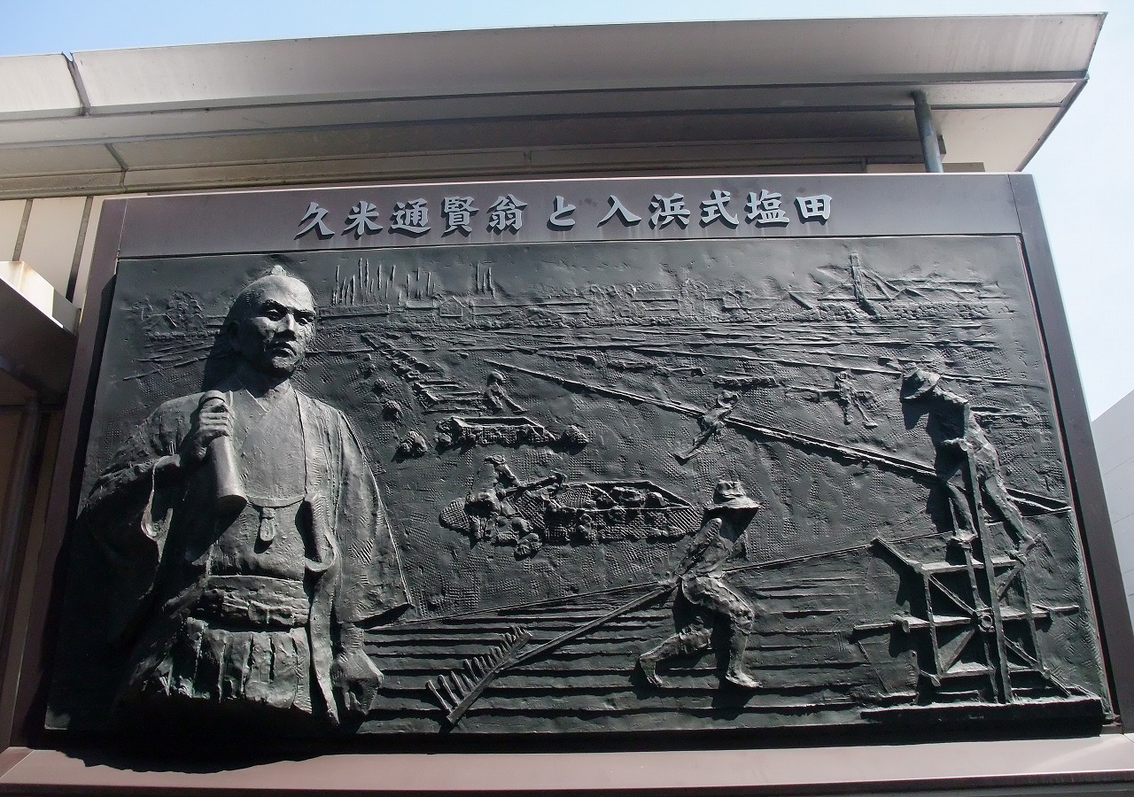 JR坂出駅北口に「久米通賢翁と入浜式塩田」のレリーフがある。平成19年に坂出商工会議所が創立70周年を記念して設置したものだ。