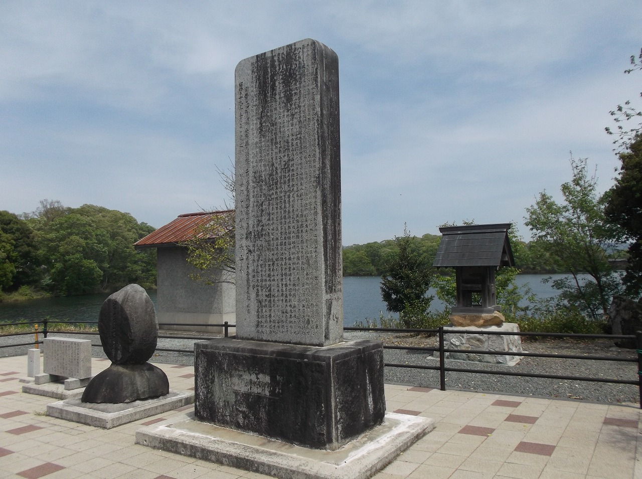正保三年(1646)の創設というこの池は、延宝三年(1675)、文久二年(1862)、明治41年(1908)、昭和28年(1953)とたびたび大規模改修が行われ、地域の水田を潤してきた。大きな記念碑の隣にある丸い碑は、文久の大改修を成し遂げた広島藩士、神川平助の記念碑である。