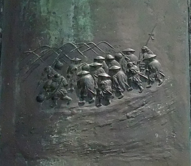 七卿西竄碑には、蓑笠をまとった公家とこれを警護する甲冑の武士の一団が、提灯をたよりに夜道を歩く様子が描かれている。このレリーフの原図は、七卿落ちの一人、沢宣嘉が明治5年に描いた「七卿落図」である。現在、萩博物館が所蔵している。