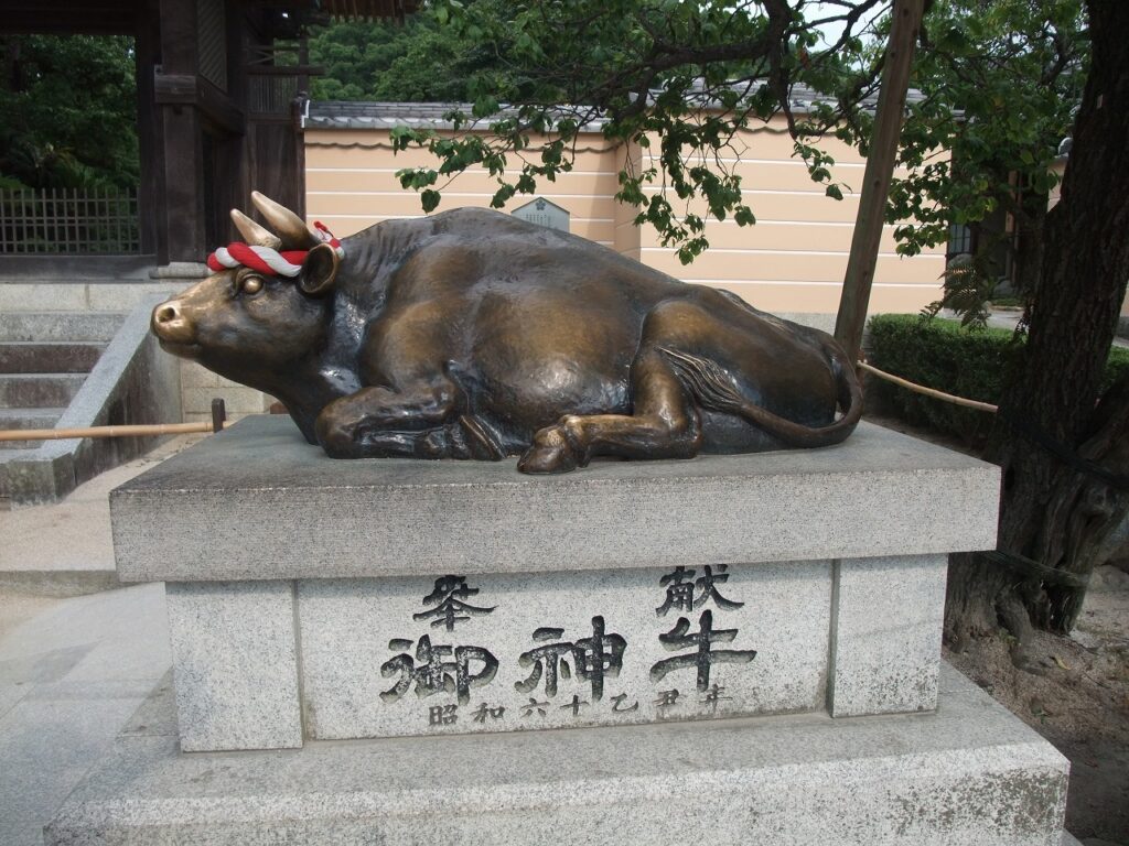 そういえば天満宮にお参りすると牛の像をよく見かける。撫牛(なでうし)といって、お参りのかたが願いを込めてなでなでするものだから、一部分にツヤが出ている。下の写真では角と鼻がテカっている。
