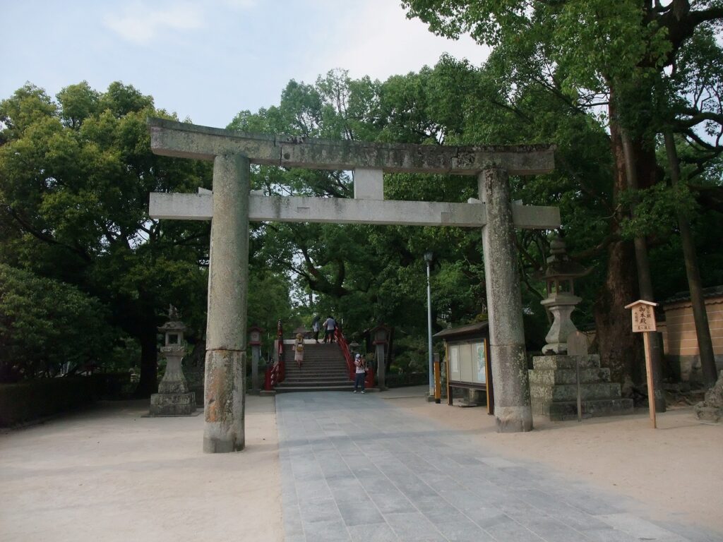 朝堂神牛が見ている方向には、このような鳥居がある。県指定有形文化財の明神鳥居で、鎌倉末期の建造と推定されている。やや横に広くスマートとは言えないが、それだけ多くの参拝者が通りやすいのだ。