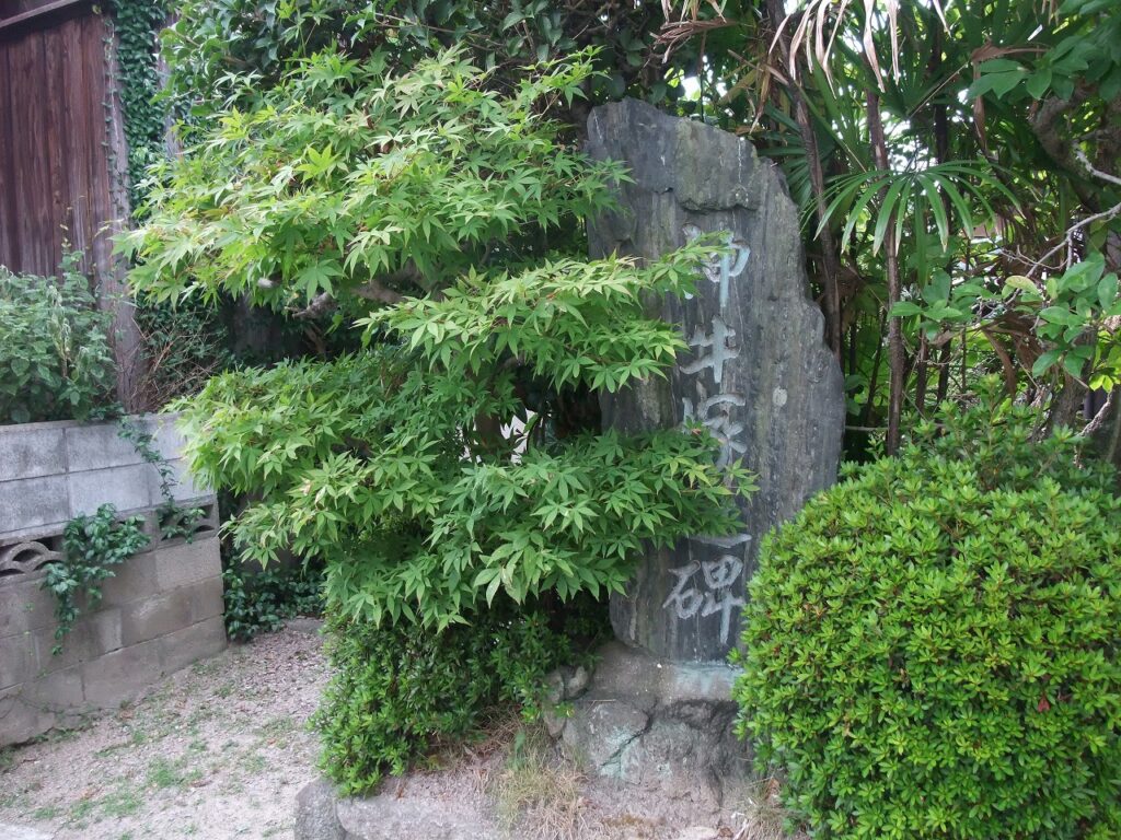 この石碑は大正14年に、丑年生まれの人たちが、還暦を祝って建てたものだそうだ。その後ろにある自然石がもとの神牛塚である。樹の蔭で少々見えにくい。