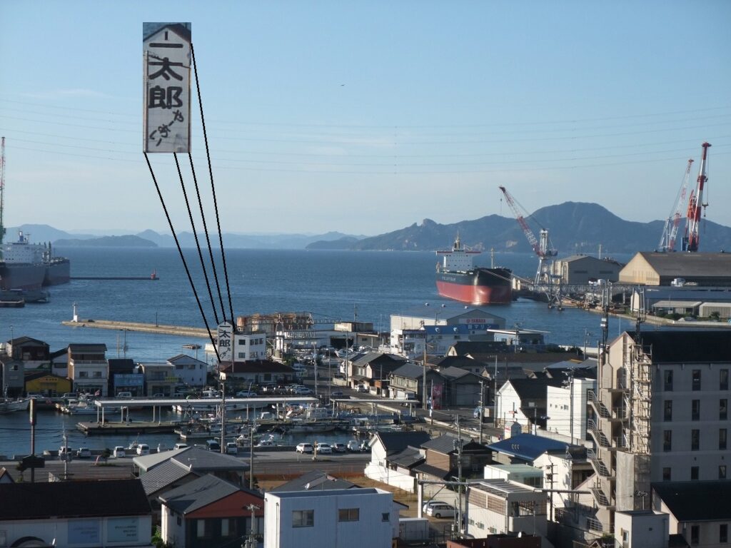 さて、お母さん像が見ているのはこのような風景である。港近くの建物の壁面に「一太郎やーあい」とある。母目線に台詞まで用意してくれて完璧なシチュエーションである。