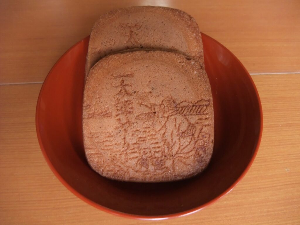 素朴で美味しいせんべいには、老母が海に向かって「一太郎ヤーイ」と叫んでいる様子が焼かれている。包装紙にはその像が描かれている。
