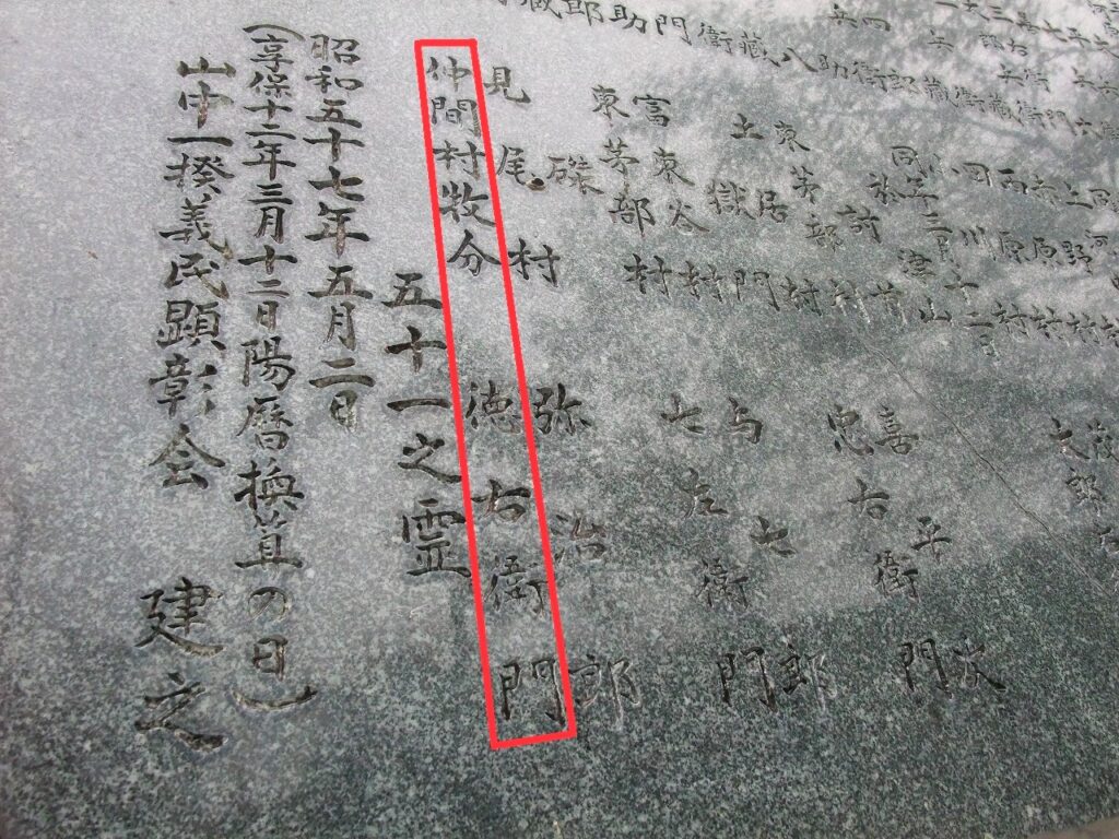 義民碑の隣には慰霊碑があり、処刑された51名の名前、居村等を刻んでいる。このうち、磔に処せられた中心的指導者、徳右衛門は仲間村牧分の住人である。