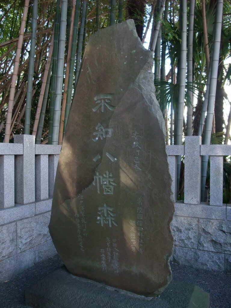 上の写真は、説明文の最後に登場する安政四年の碑である。伊勢屋宇兵衛は醤油を扱う「伊勢宇」とも呼ばれる富商で、各地に石橋を架けた篤志家でもあった。写真の碑も「不知八幡森」の保存を念頭に建立したものであろう。とすれば伊勢宇は、ESD(ええものを子孫の代まで)の精神の持ち主だといえよう。