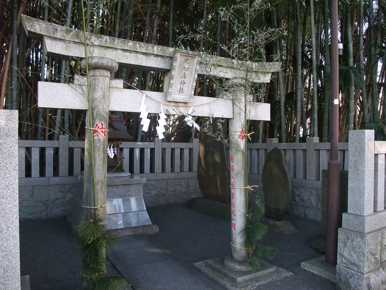 人通りの多い場所にあり、朝に訪れたので見て気味が悪いとは感じなかったが、足の踏み場もないほど荒れた竹藪で、とても入れるとは思えない。近くの葛飾八幡宮の境外地で、不知森(しらずもり)神社がある。