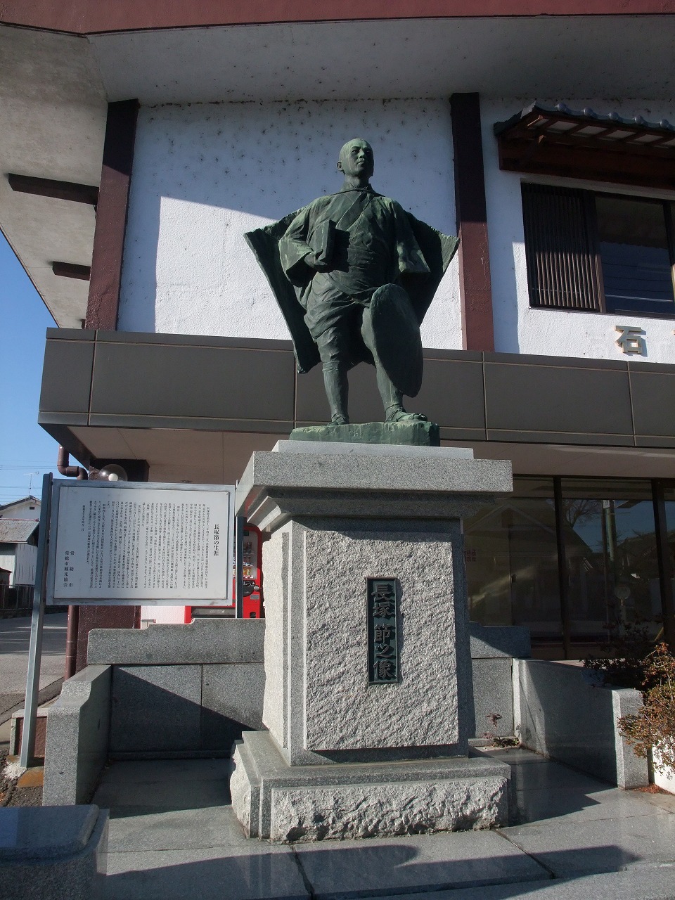 常総市本石下の石下中央公民館前に「長塚節之像」がある。同じ旅姿の像が、長塚節生家、豊田城(地域交流センター)にもある。石下の誇る文化人なのである。