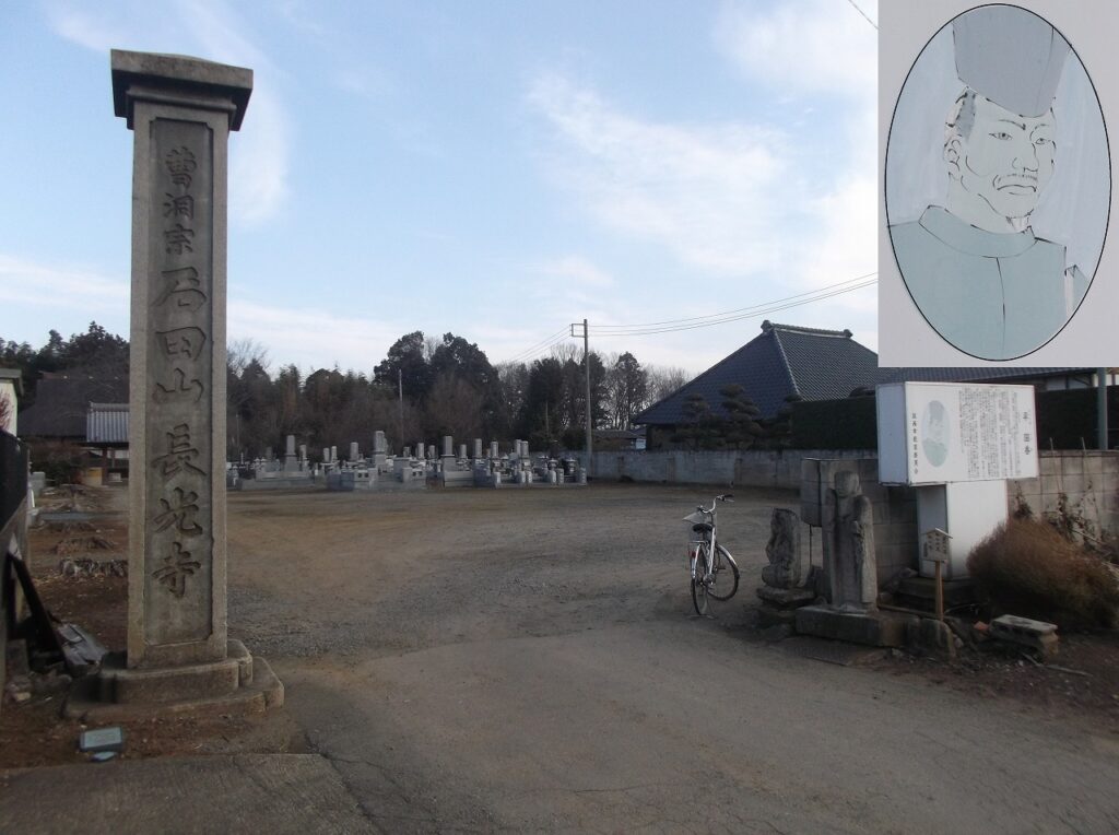 「ゆかりの地」というのも微妙な表現だ。生まれたのか没したのか、それとも戦ったのか。この看板を通り過ぎると「石田山長光寺」がある。曹洞宗のお寺である。この門前に肖像画付きの説明がある。文は長いが、それほど内容があるわけではない。