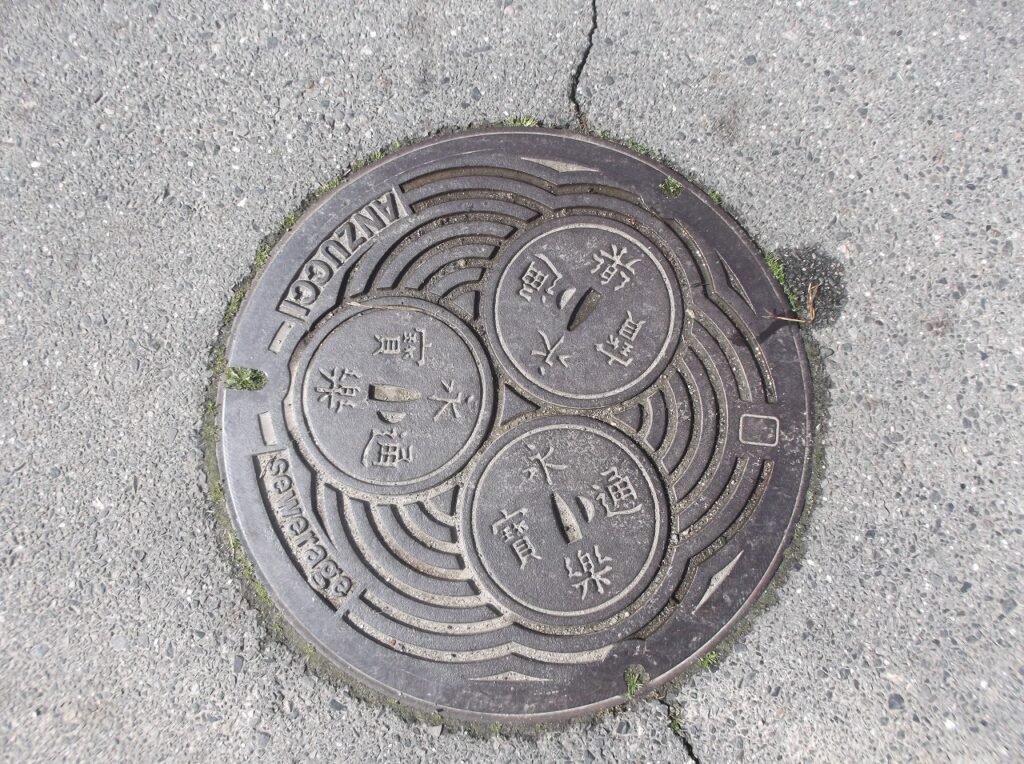 これは旧安土町のマンホールの蓋である。「ANZUCCI」は安土で、かつて宣教師がそのように表記していたとか。「sewerage」は下水道である。