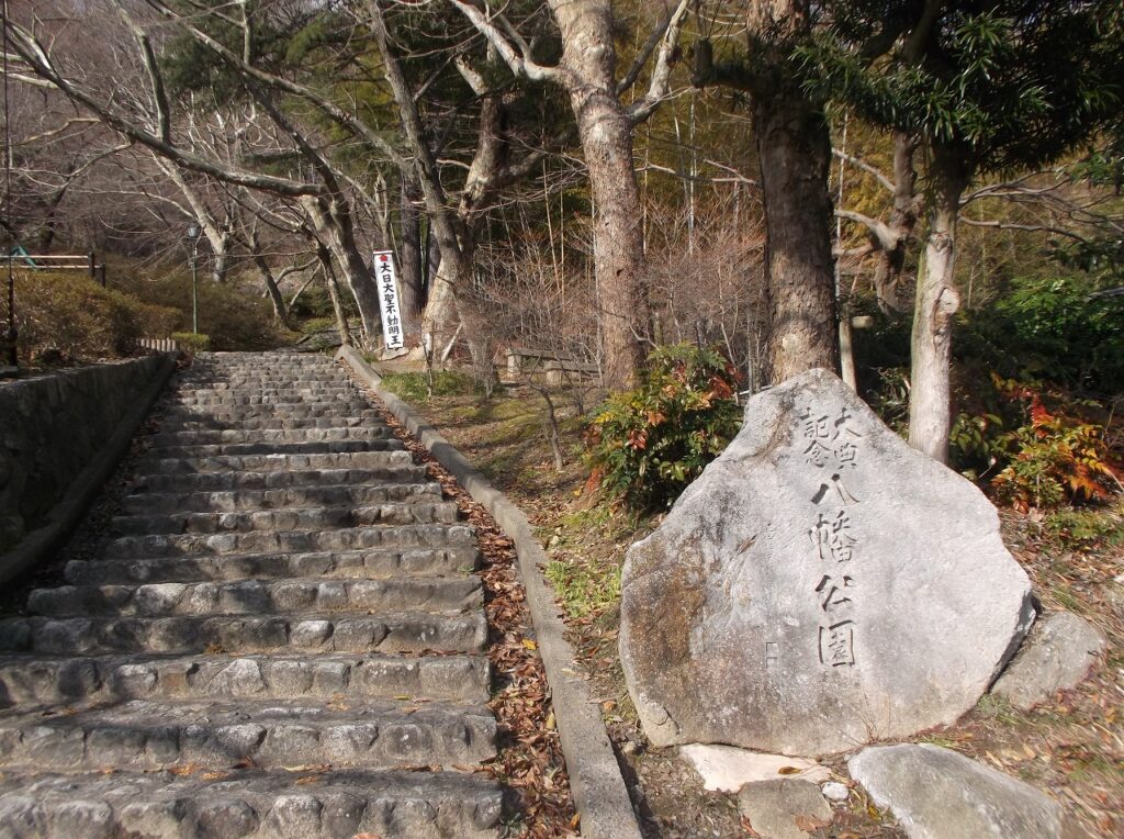 公園の入口に「大典記念 八幡公園」と刻まれた石碑がある。「正三位子爵豊臣俊哲書」とあるので、旧日出(ひじ)藩主家の木下俊哲(としあき)の揮毫だ。豊臣一族の絆が感じられる。裏には「昭和五年四月」とも刻まれている。昭和天皇の御大典を記念したものだと分かる。