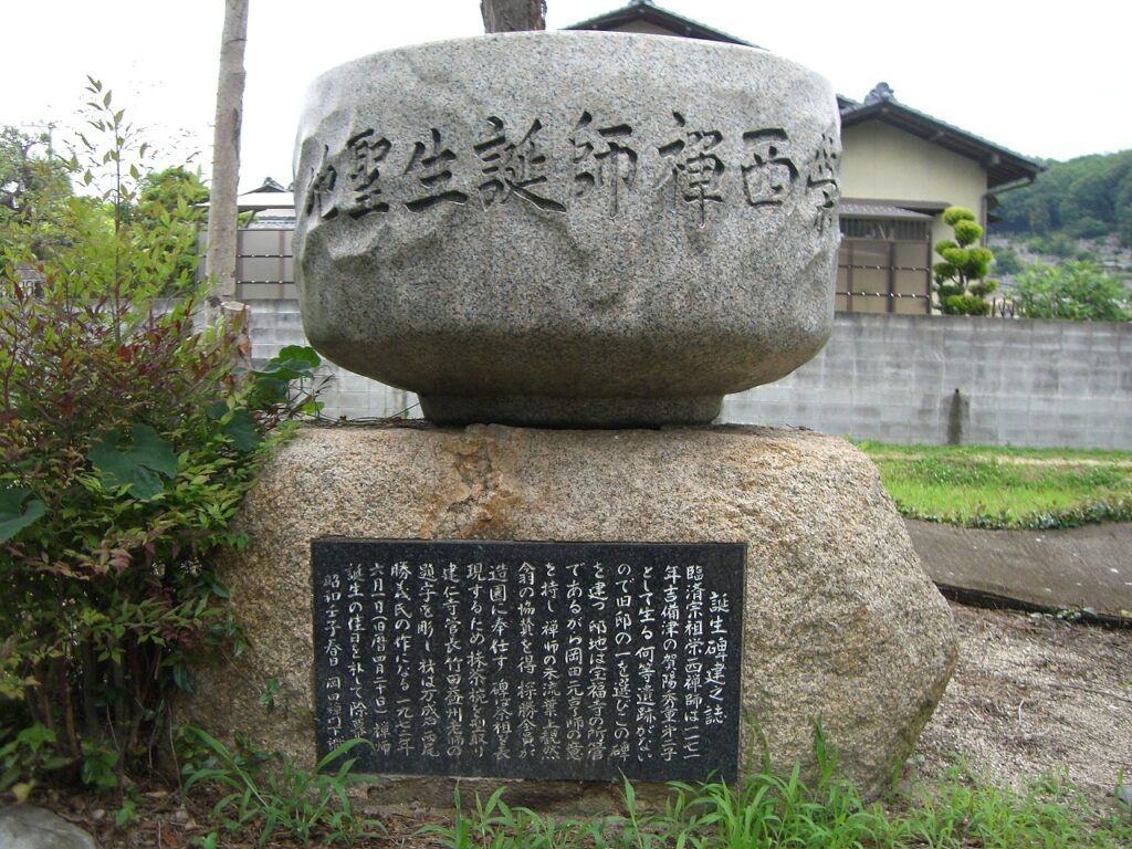抹茶椀をかたどっているのが「茶祖」にふさわしい。「栄西禅師誕生聖地」の揮毫は建仁寺445世、第8代管長、竹田益州師である。建仁寺の開山はもちろん栄西だ。