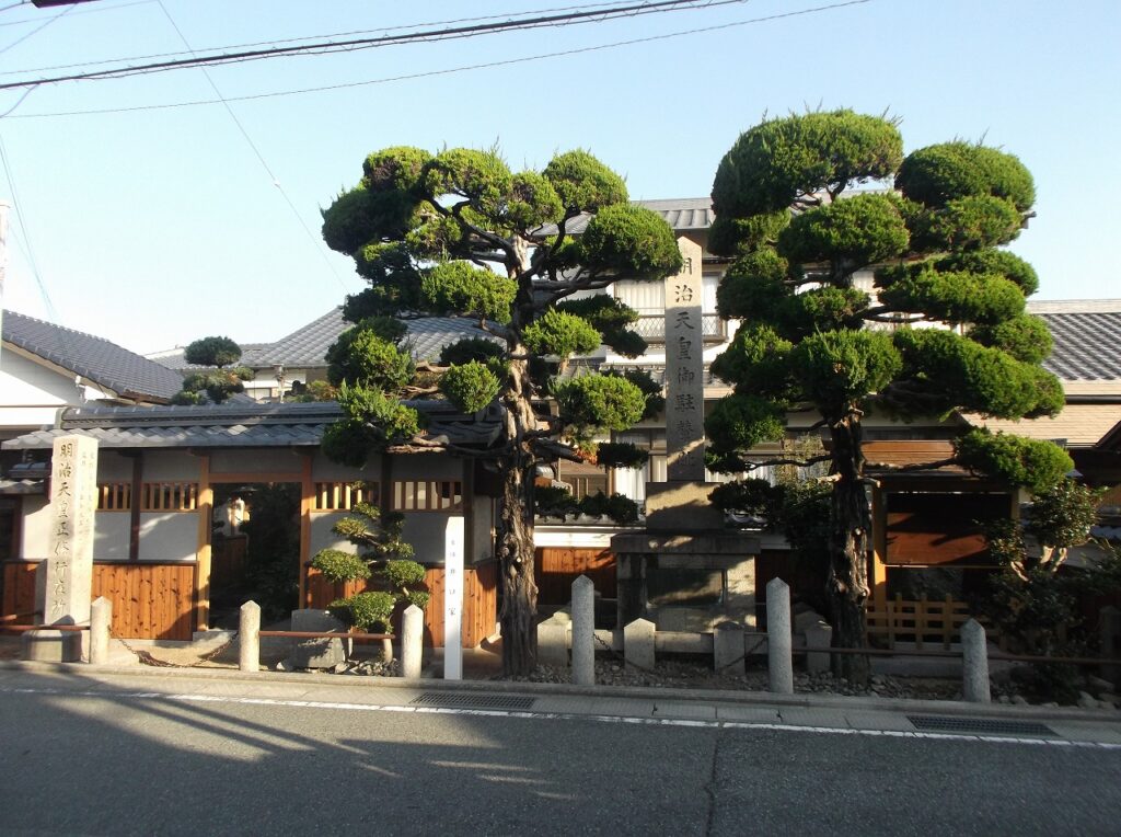 旧山陽道に面して石碑があるが、その背後は正條宿の本陣を務めていた井口家である。明治天皇が井口家で昼食をとったのは、明治18年(1885)8月8日のことである。