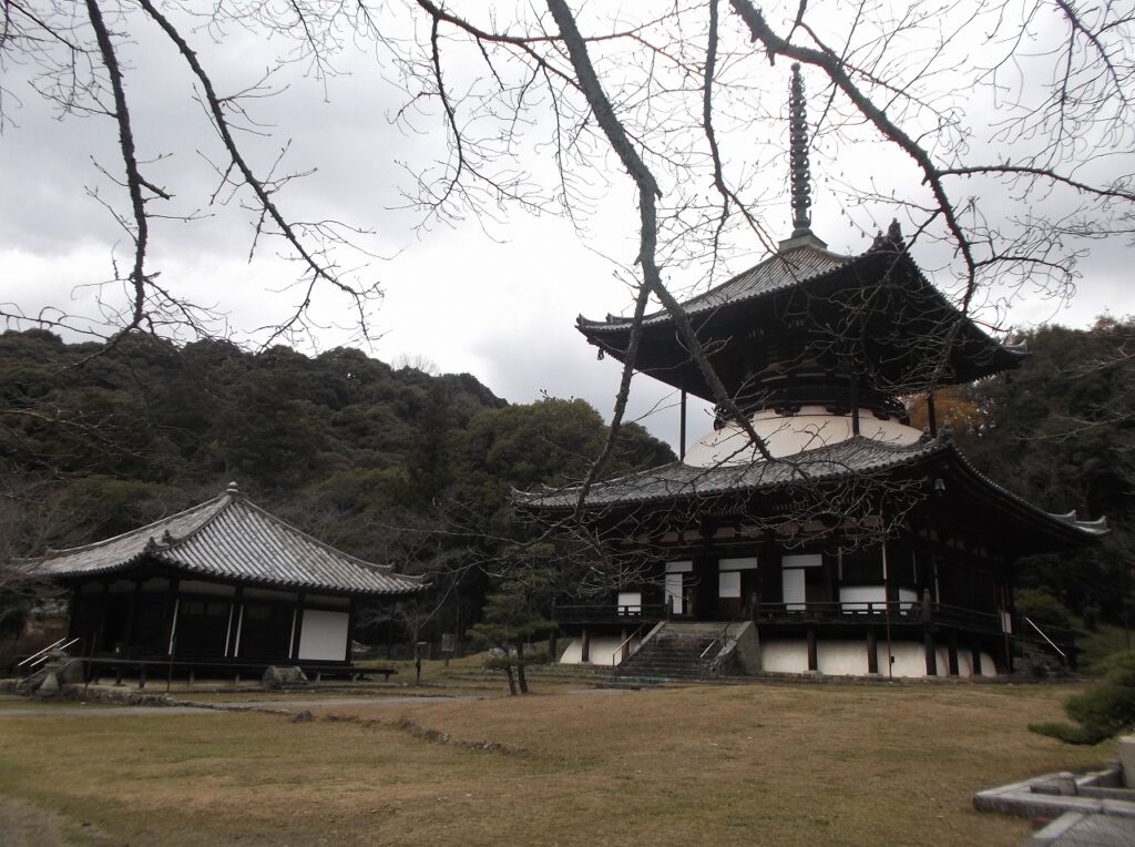 岩出市根来の根来寺に「大塔(だいとう)」がある。高さ36mという日本最大の木造多宝塔で、国宝に指定されている。左に見える「大師堂」は明徳2年(1391)の建立で、国の重要文化財に指定されている。