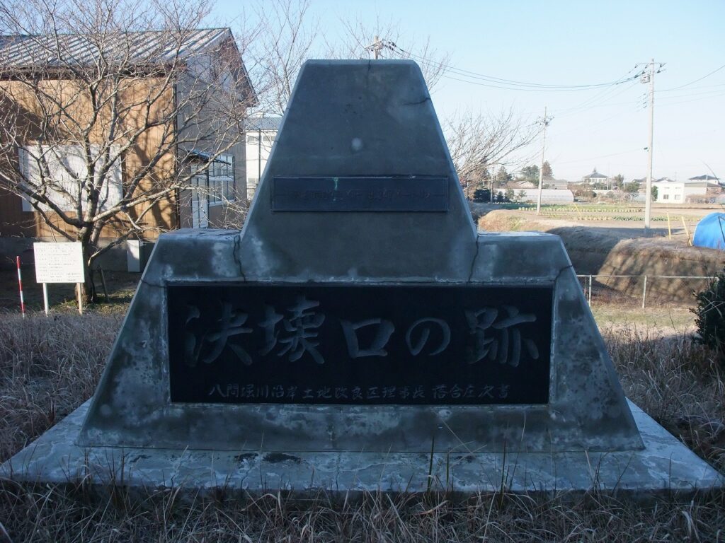 常総市本豊田(もととよだ)の小貝川の堤防に「決壊口の跡」の碑がある。堤防の断面を表した形状である。