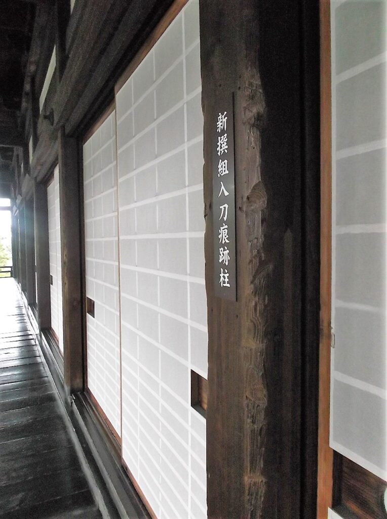 なぜ、このような刀の傷があるのだろうか。刀を抜身のまま出入りしたのか。ここで喧嘩になって斬り合ったのか。暇つぶしか腹いせで柱を削ったのか。いずれにしろ器物損壊罪に該当する。新撰組はお詫びやら弁償をしたのだろうか。