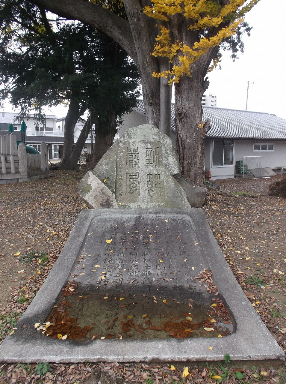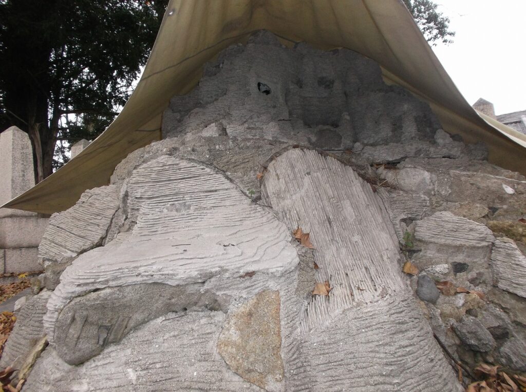 「西南の役石碑」は明治12年に建てられたというが、どこか前衛芸術のような配置である。かつては別の場所にあり、台座の上に奥の題額の碑が置かれ、手前の銘板は台座にはめ込まれていたらしい。