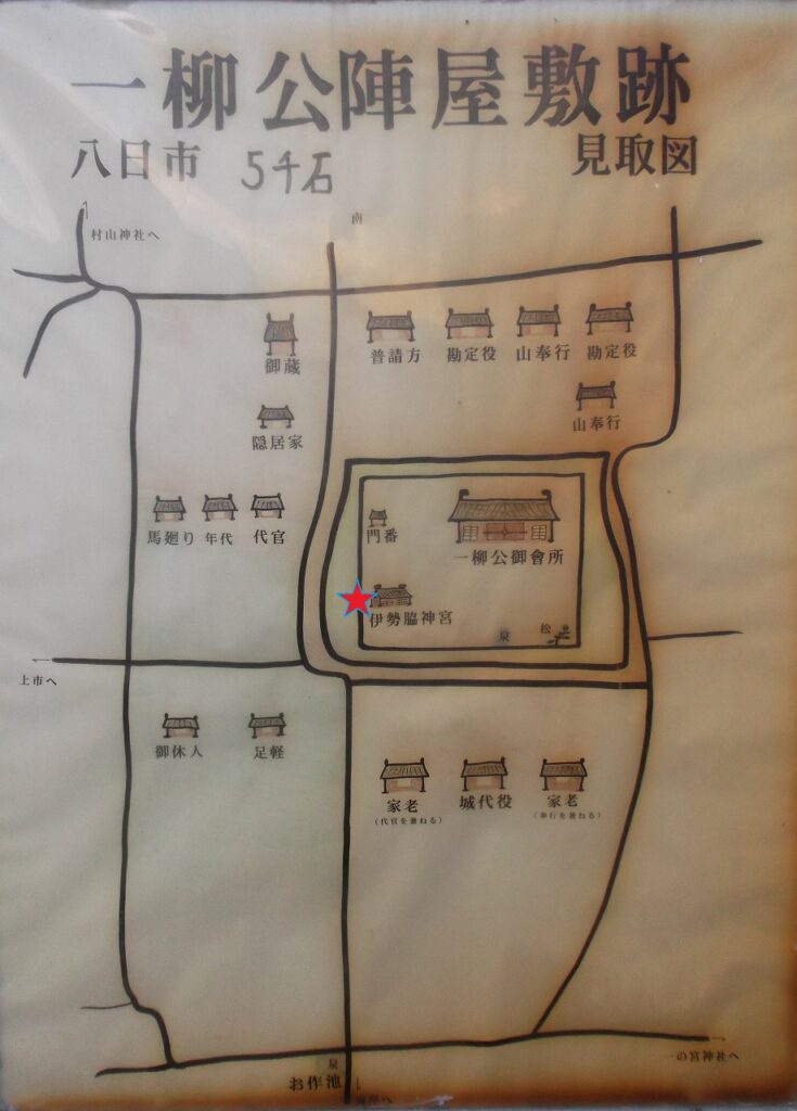 この陣屋は一般に「八日市陣屋」と呼ばれている。陣屋周辺の見取図があるので拡大してみよう。見取図は上が南で描かれているから、星印が写真の位置となる。