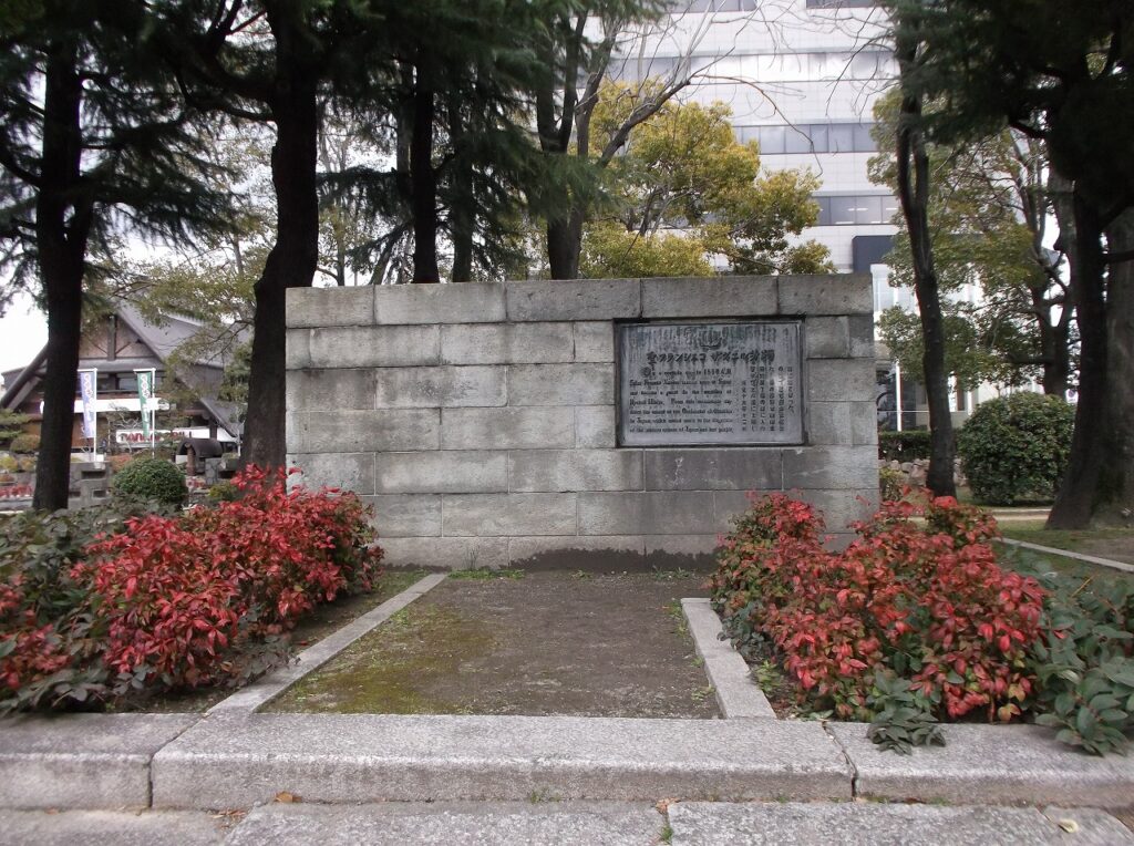 山口から岩国まで歩き、ここから瀬戸内海を船で進んだ。途中寄港した港で、ある有力者が堺の豪商・日比屋了慶(了珪)を紹介してくれた。堺に着いたザビエルは了慶の館に入った。瓦葺三階建のある大邸宅が、この公園のあたりにあったという。