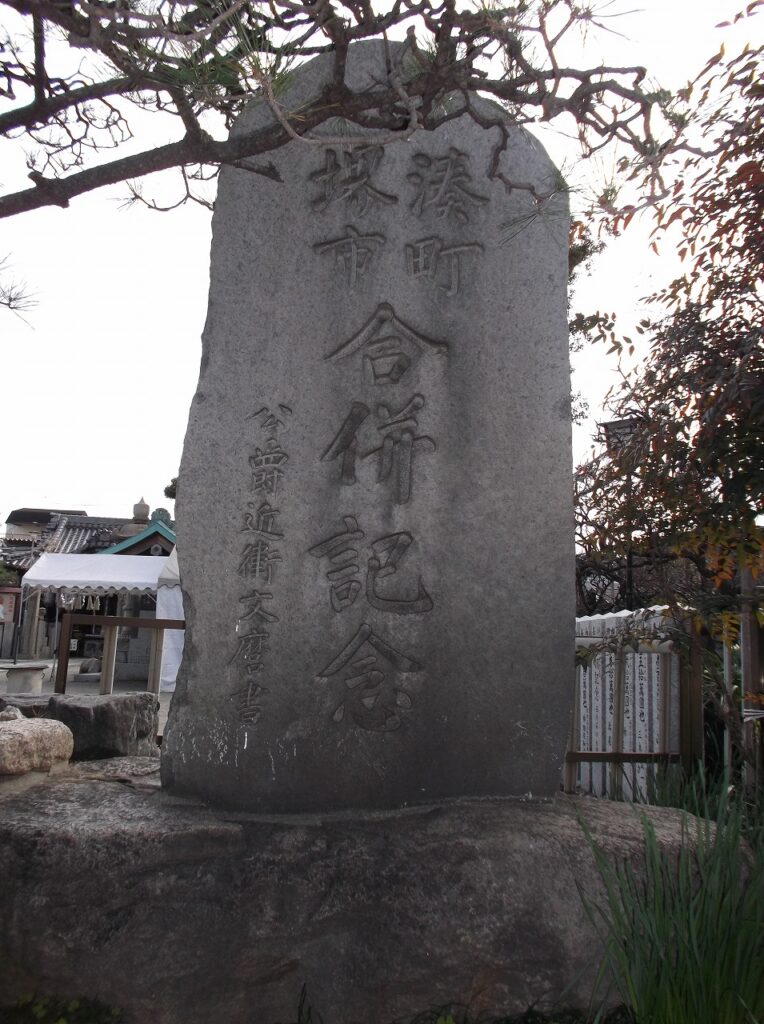 堺市堺区西湊町1丁の船待神社の境内に「湊町堺市合併記念」と刻まれた碑がある。この合併は古い話で、大正9年(1920)のことである。