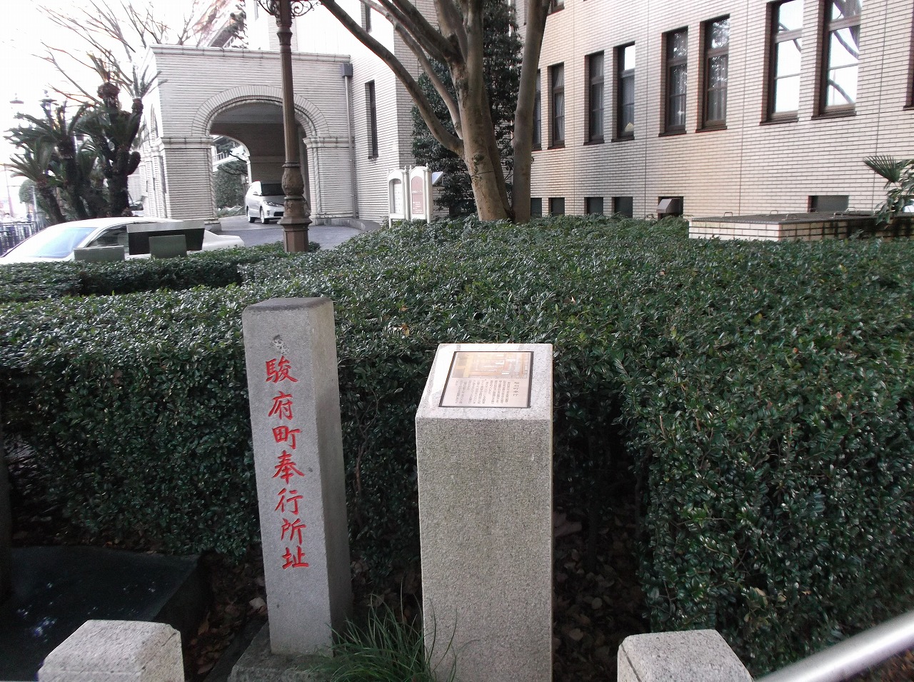静岡市葵区追手町(おうてまち)の静岡市役所前に「駿府町奉行所址」の碑がある。