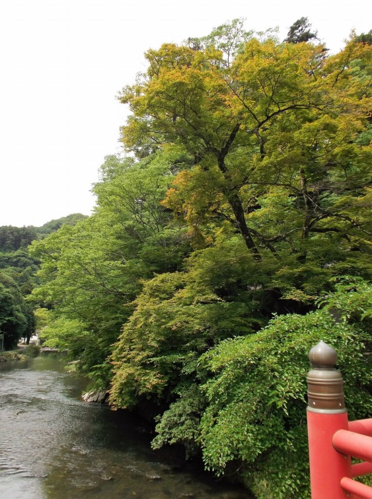 天神社の前には、県の特別名勝「天神峡」が広がっている。写真は梅雨空で冴えないが、秋の紅葉は素晴らしいと聞く。山水を愛した雪舟のことだ。この地を訪れたのも事実かもしれない。道真公の木像も、あるいは本当に飛んで、天神峡の美しさに魅せられて舞い降りたのではなかろうか。