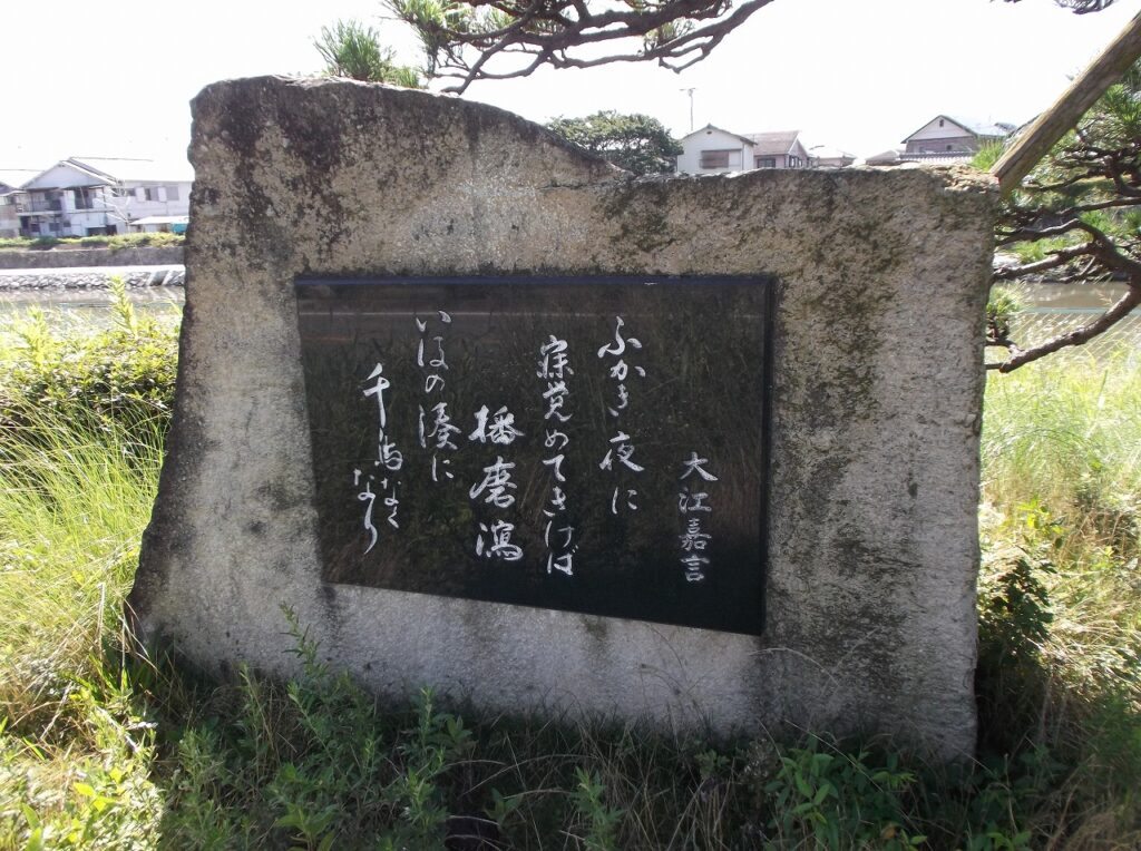 大江嘉言は平安時代中期の歌人で、紫式部と同時代の人だ。歌は『拾遺和歌集』などの勅撰集に入選している。歌碑の歌を読んでみよう。