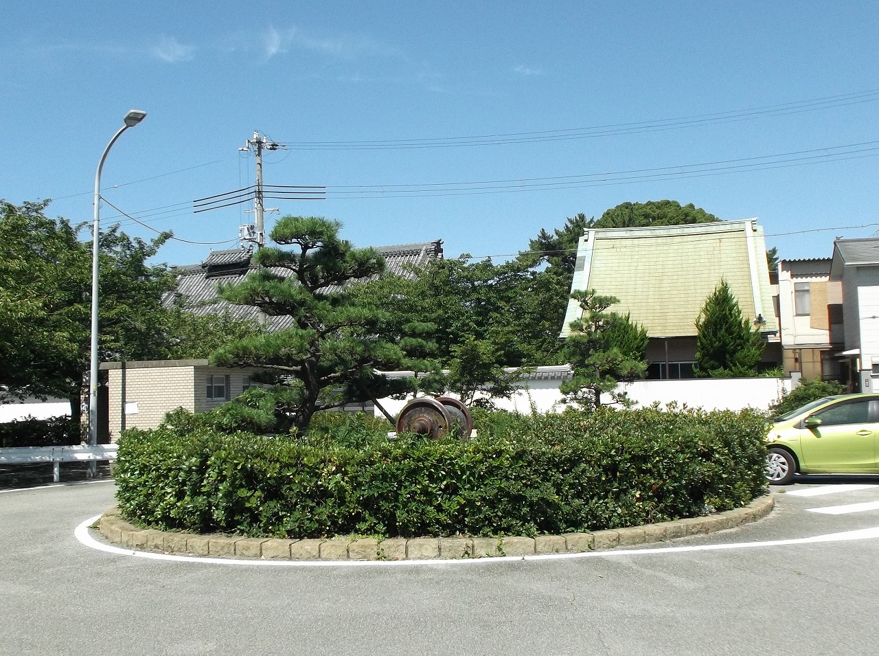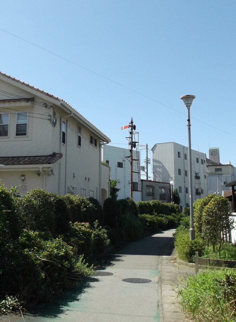 高砂線本線と国鉄高砂工場などにつながる専用線とが合流する地点に、腕木式信号機がモニュメントとして保存されている。写真の緩いカーブは専用線で、左手の本線と合流して高砂駅に至る。