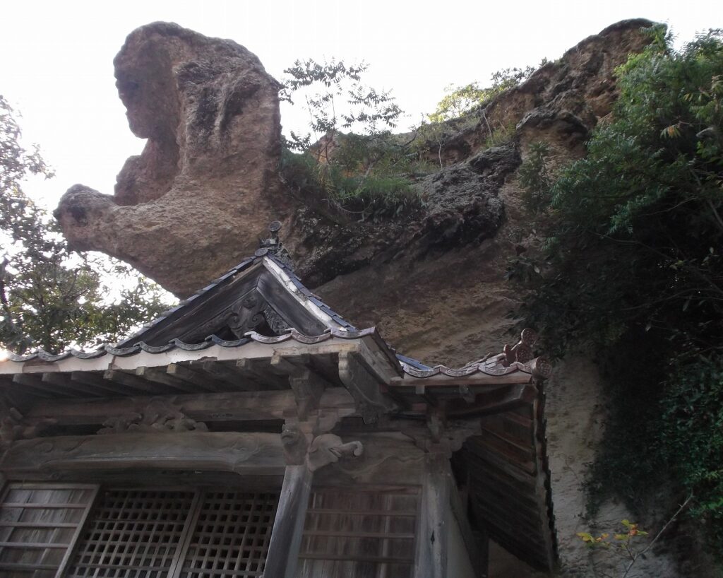 「山勢自から巨龍の蟠るに以たる磐窟あり」とある。姿が大きな龍に似た岩があるのだという。ああ、なんだ。岩だったのか。龍のアゴの下にあるのが、かつての本殿だという。せっかくだから、そこまで行ってみよう。