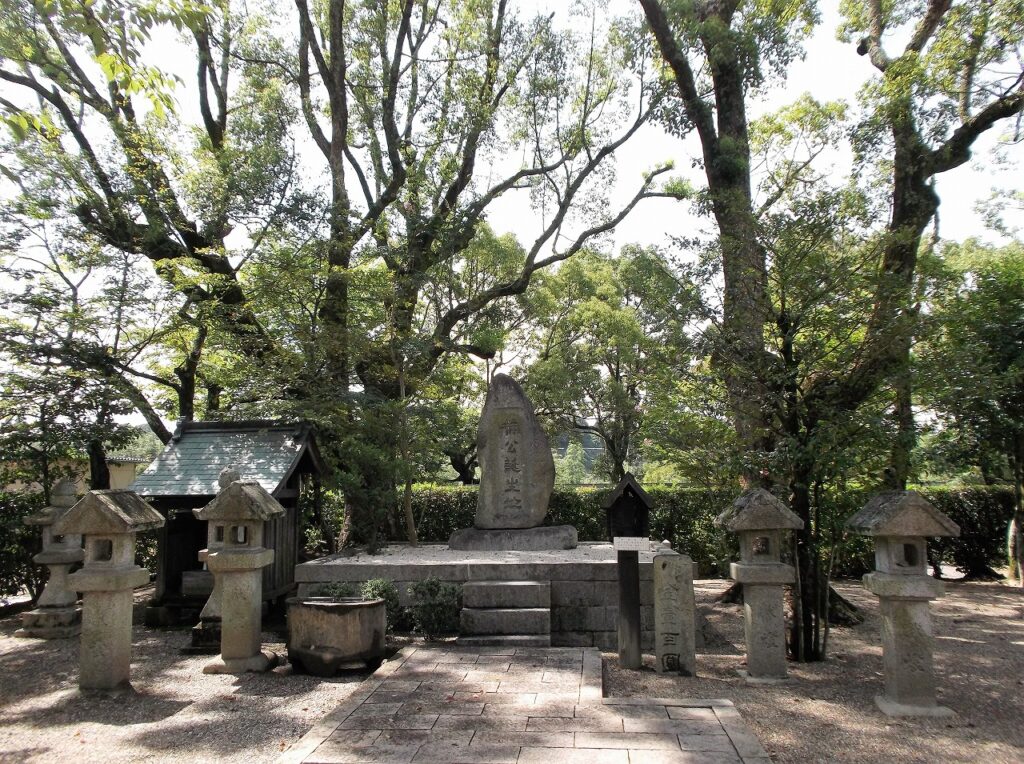 碑文の「楠公誕生地」は、幕末勤王派の三剣豪の一人で、当時誉田八幡宮の祠官であった桃井春蔵直正の揮毫によるものである。