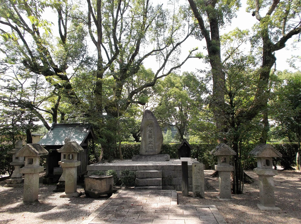 石碑の周囲には大きなクスノキが林立している。これは「伏見宮博義王殿下御手植楠樹」で、根元にある標柱の裏面には「大正三年十月六日御台臨」と刻まれている。かつては皇族方がしばしば来訪して植樹をされたようだ。