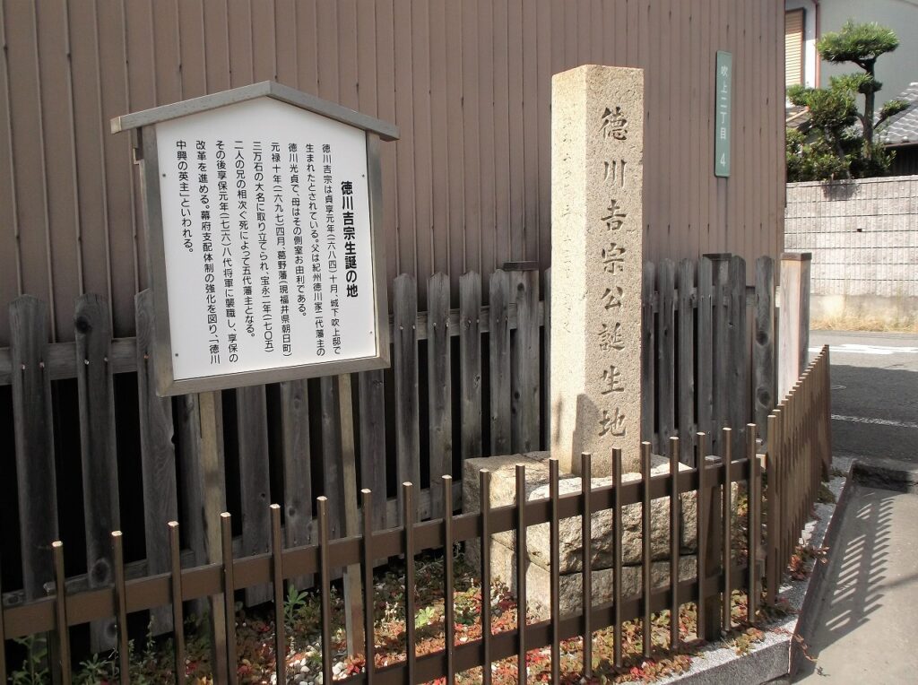 和歌山市吹上二丁目に「徳川吉宗公誕生地」の石碑がある。「城下吹上邸で生まれたとされている」と少々心許ない説明だ。それは母の出自が関係している。