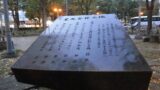 本丸跡に並ぶ天草四郎と佐分利九之丞。当然ながら主役は四郎のように思えるが、江戸時代に四郎の墓はここになく、四郎の像は巨匠・北村西望の作品だ。昔から変わらず本丸跡に眠っているのは九之丞なのである。