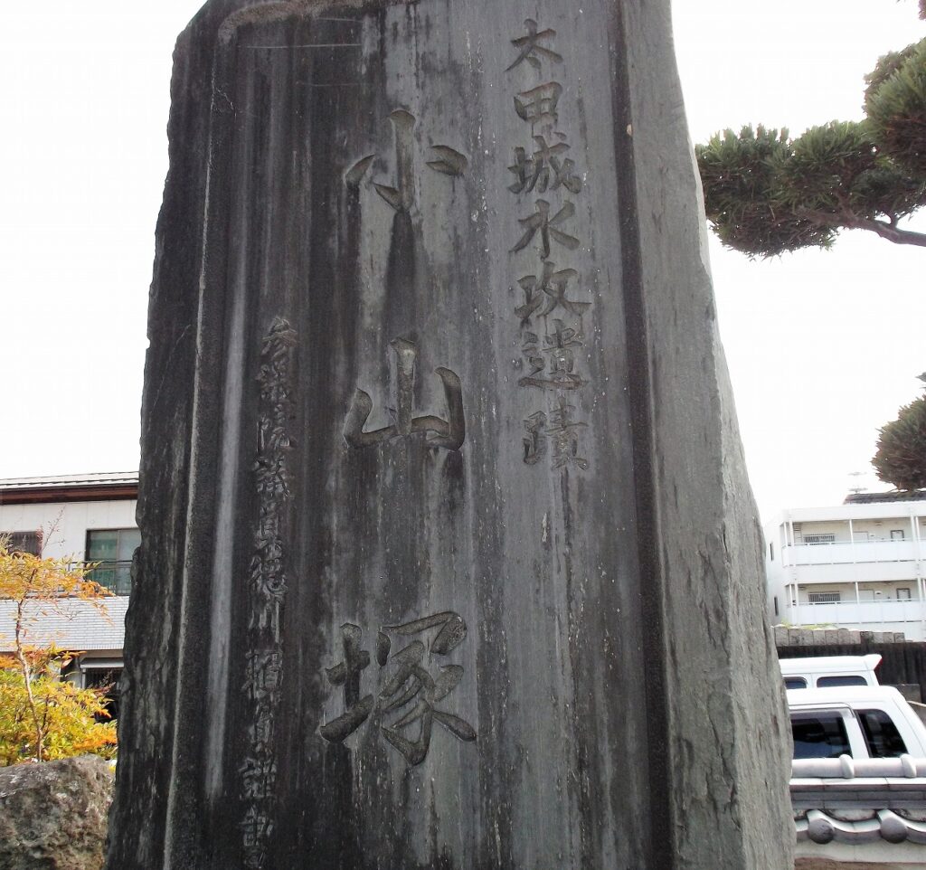 開城後、主な武将53人が斬首され、3か所に分けて首塚が築かれた。「小山塚」はその一つという。揮毫は参議院議員徳川頼貞、紀州徳川家16代目である。