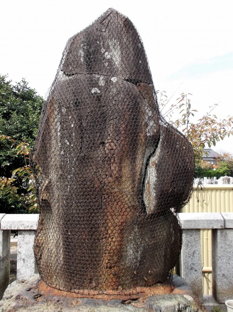 保護のため被せられた金網が、又右衛門が仇討で着ていた鎖帷子(くさりかたびら)に見える。法名の「秀誉行念禅定門」も読み取れる。