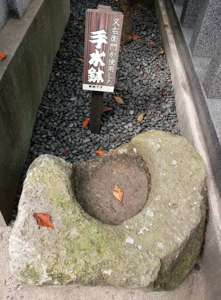 冒頭の絵馬があるのは鳥取市元町の荒木神社で、社殿の脇には「又右衛門が使用した手水鉢」がある。ここには荒木又右衛門の屋敷があった。手水鉢が割れているのは、昭和27年の鳥取大火の猛火に包まれたからだ。