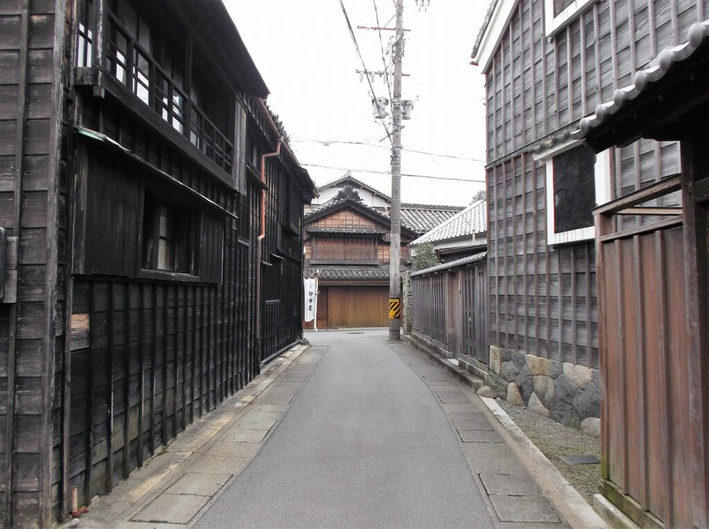 旧環濠内には、切妻妻入りの町家や蔵が川岸に沿って建ち並び、かつての河崎の町の繁栄を示す歴史的風景を今に伝えています。
