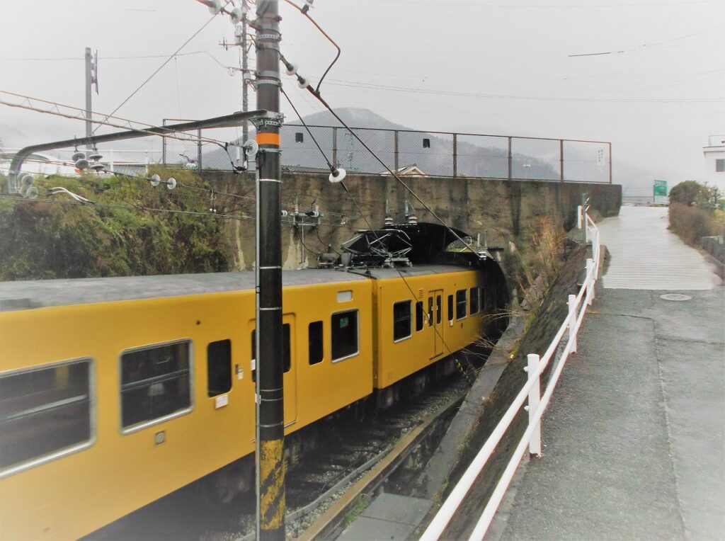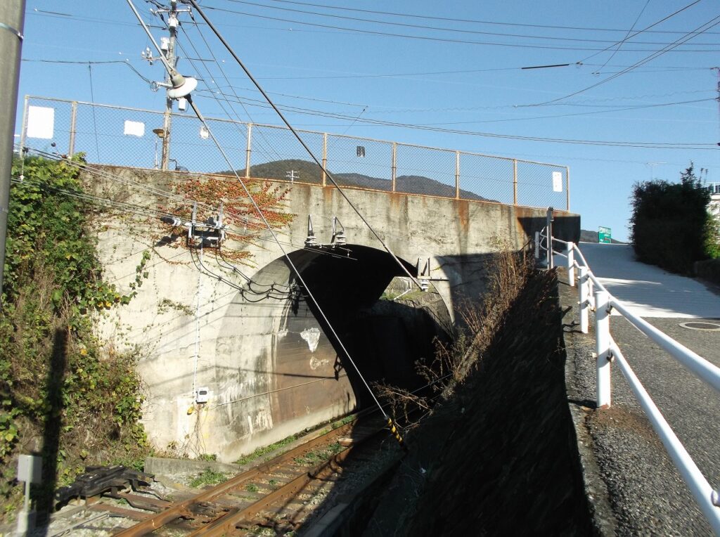 トンネル部分と県道「さざなみスカイライン」の跨線橋が一体化しているので、少々長く見える。車道ではなく、幅の広い歩道の部分がトンネルである。